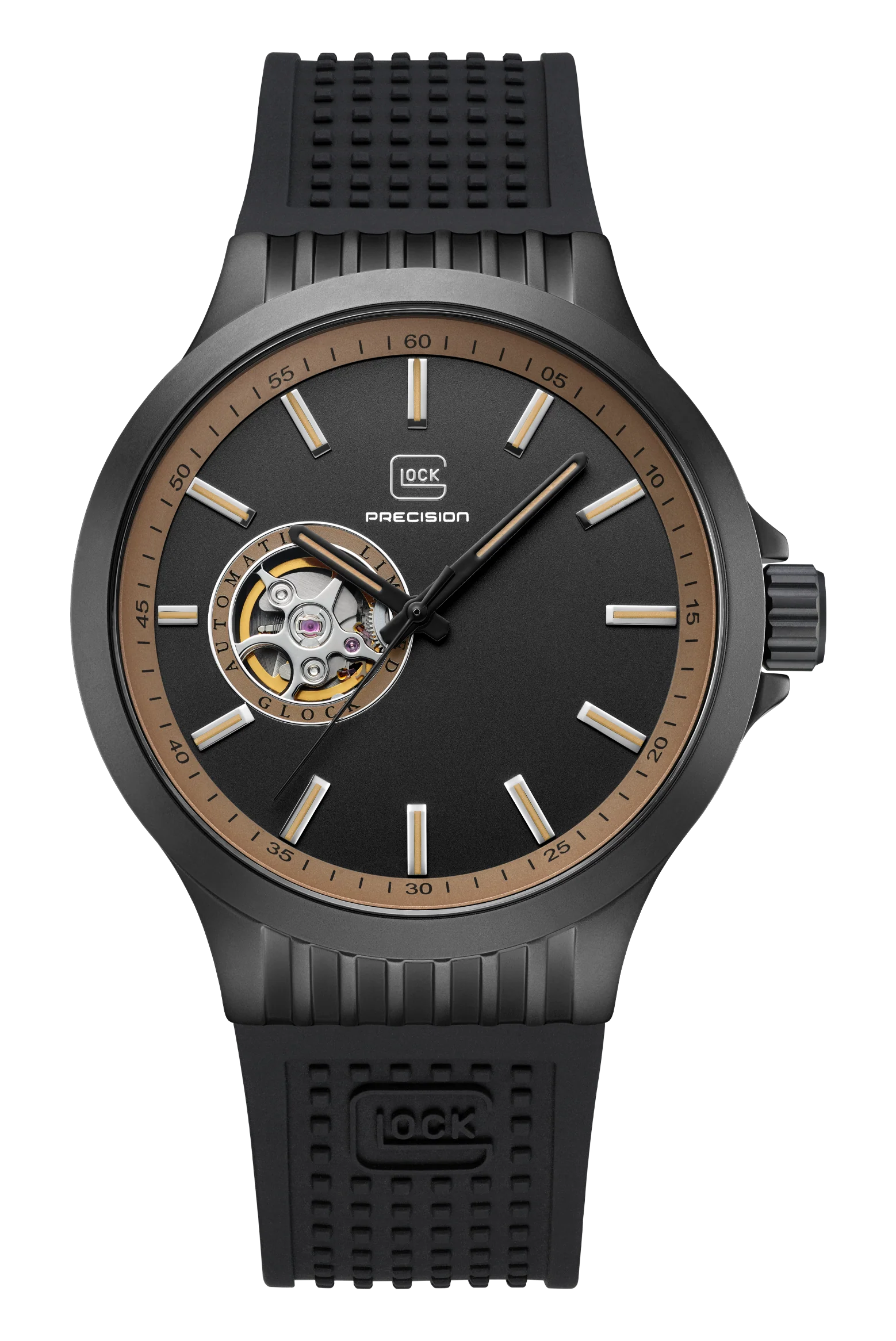 10 ATM WATER RESISTANCE, AUTOMATIC MOVEMENT, Swiss Super-LumiNova®Mechanical precision meets contemporary style in this refined automatic timepiece. The gunmetal-tone stainless steel case frames a matching dial accented by a warm brown outer ring, creating a sophisticated depth of contrast. Its open-heart design reveals the intricate motion of the automatic movement within—a tribute to mechanical craftsmanship. Hands and indices coated with Swiss Super-LumiNova® ensure optimal legibility in any light. The black silicone strap, featuring GLOCK’s signature RTF texture, adds a modern, tactical edge while ensuring lasting comfort. With a water resistance of 10 ATM, this watch unites engineering excellence, resilience, and unmistakable GLOCK design.