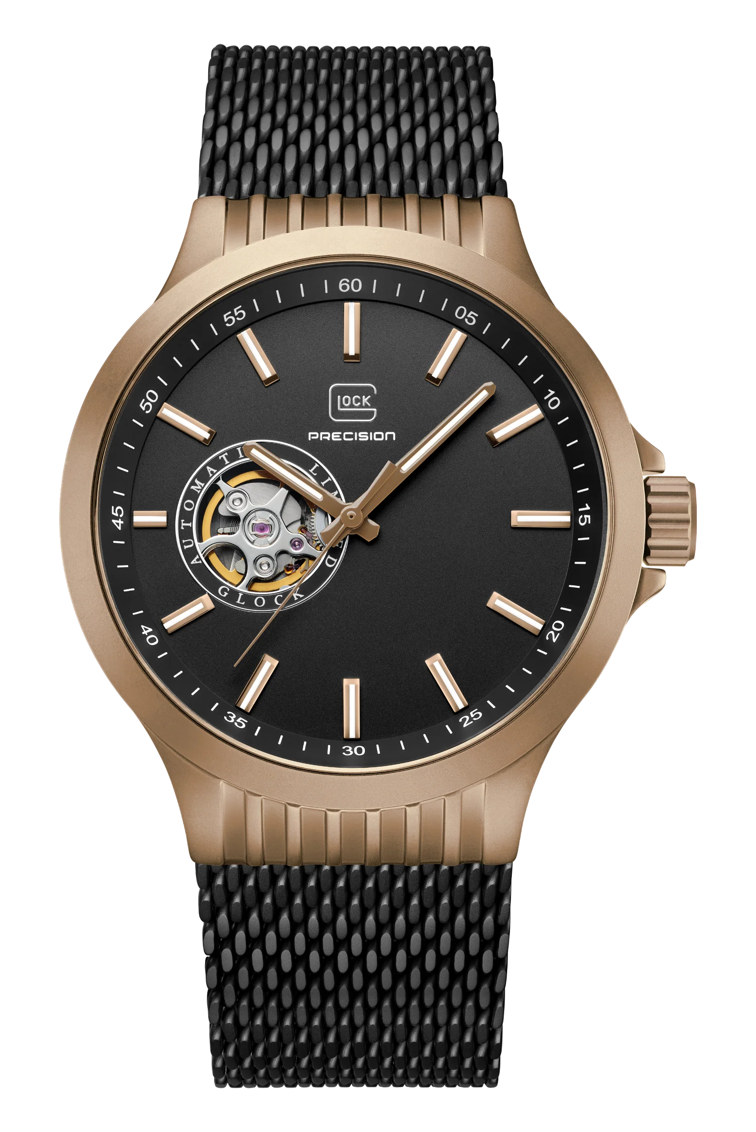 10 ATM WATER RESISTANCE, AUTOMATIC MOVEMENT, Swiss Super-LumiNova®Refined engineering meets bold design in this distinctive automatic timepiece. The coyote-tone stainless steel case frames a deep black dial featuring an open-heart design that reveals the rhythmic precision of the movement within. Coyote-tone hands and indices with Swiss Super-LumiNova® create a harmonious contrast, ensuring clear readability while maintaining the watch’s cohesive aesthetic. The black mesh strap adds a touch of modern sophistication, offering both comfort and durability. With a water resistance of 10 ATM, this watch blends mechanical craftsmanship, tactical elegance, and the unmistakable character of GLOCK design.