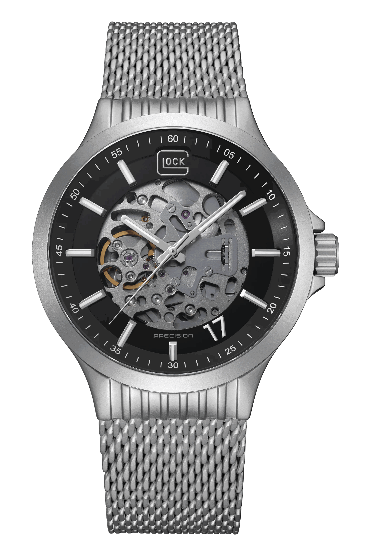 10 ATM WATER RESISTANCE, AUTOMATIC MOVEMENT, SAPPHIRE CRYSTAL, Swiss Super-LumiNova®This timepiece showcases a sandblasted stainless steel case. Its skeletonized dial takes center stage, adorned with hands and indices featuring Swiss Super-LumiNova®. The appealing design is accentuated by an elegant mesh strap. Driven by an automatic movement and rated to 10 ATM water resistance, this watch guarantees consistent accuracy and reliability.