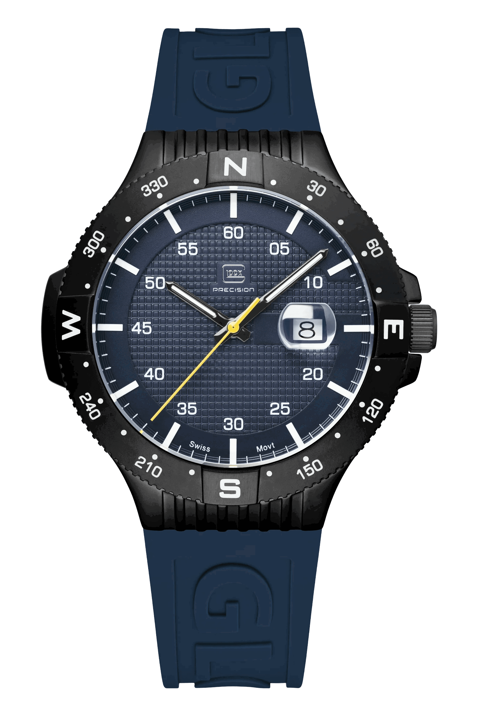 20 ATM WATER RESISTANCE, SWISS MOVEMENT, SAPPHIRE CRYSTAL, ROTATING BEZELEncased in a gunmetal sandblasted stainless steel housing, the blue dial features hands and indices with Swiss Super-LumiNova® and a striking yellow second hand. A blue silicone strap with GLOCK lettering encircles the wrist, creating an athletic look. Powered by a Swiss movement and rated to 20 ATM water resistance, this watch represents durability and resilience.