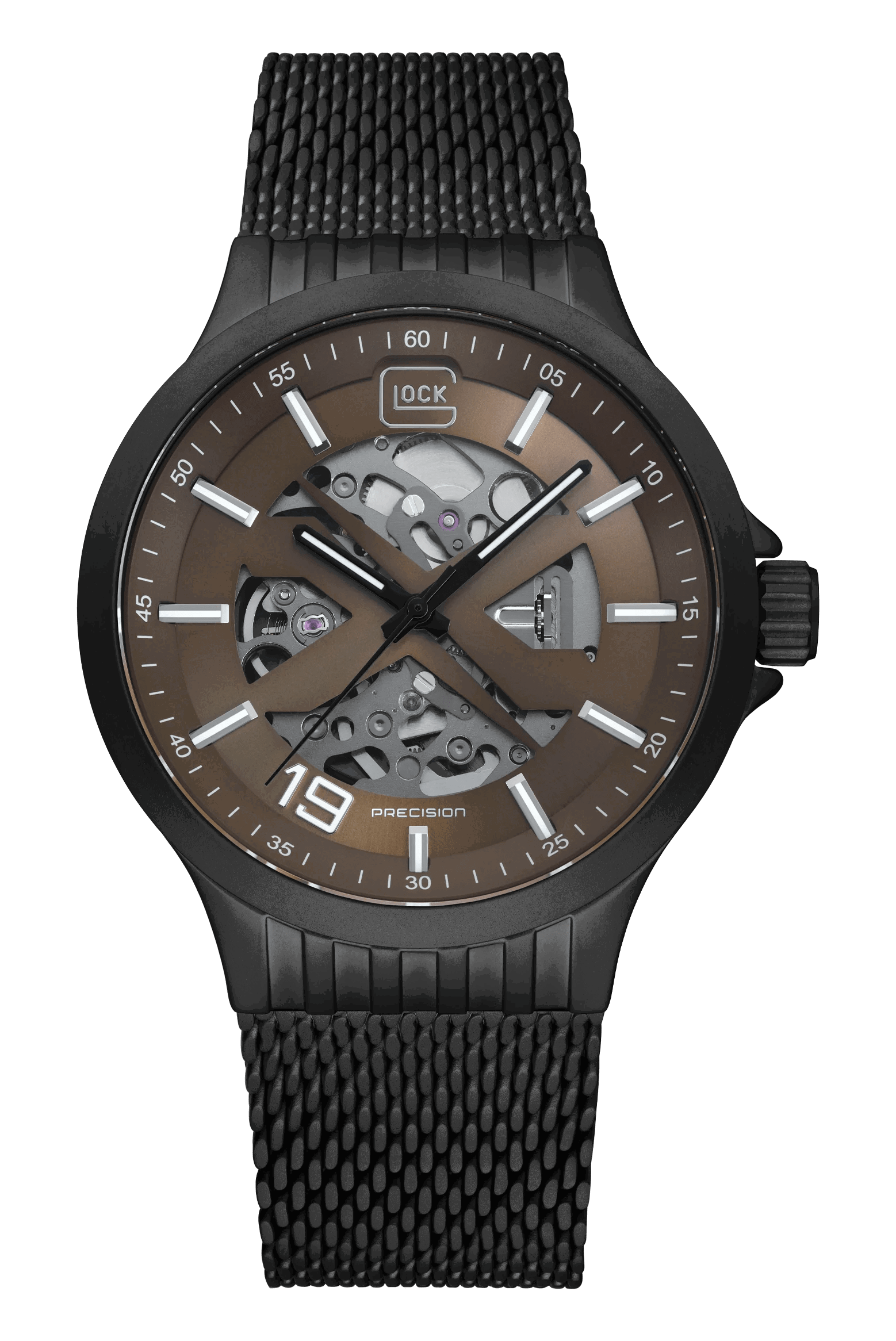 10 ATM WATER RESISTANCE, AUTOMATIC MOVEMENT, SAPPHIRE CRYSTAL, Swiss Super-LumiNova®Encased in gunmetal sandblasted stainless steel, the skeletonized dial lays bare the inner mechanisms. Silver-tone and black hands and indices with Swiss Super-LumiNova® elegantly contrast with the coyote-toned dial, while the black mesh strap imparts an elegant touch to the overall design. Powered by an automatic movement and boasting a 10 ATM water-resistance rating, this watch is a dependable companion.