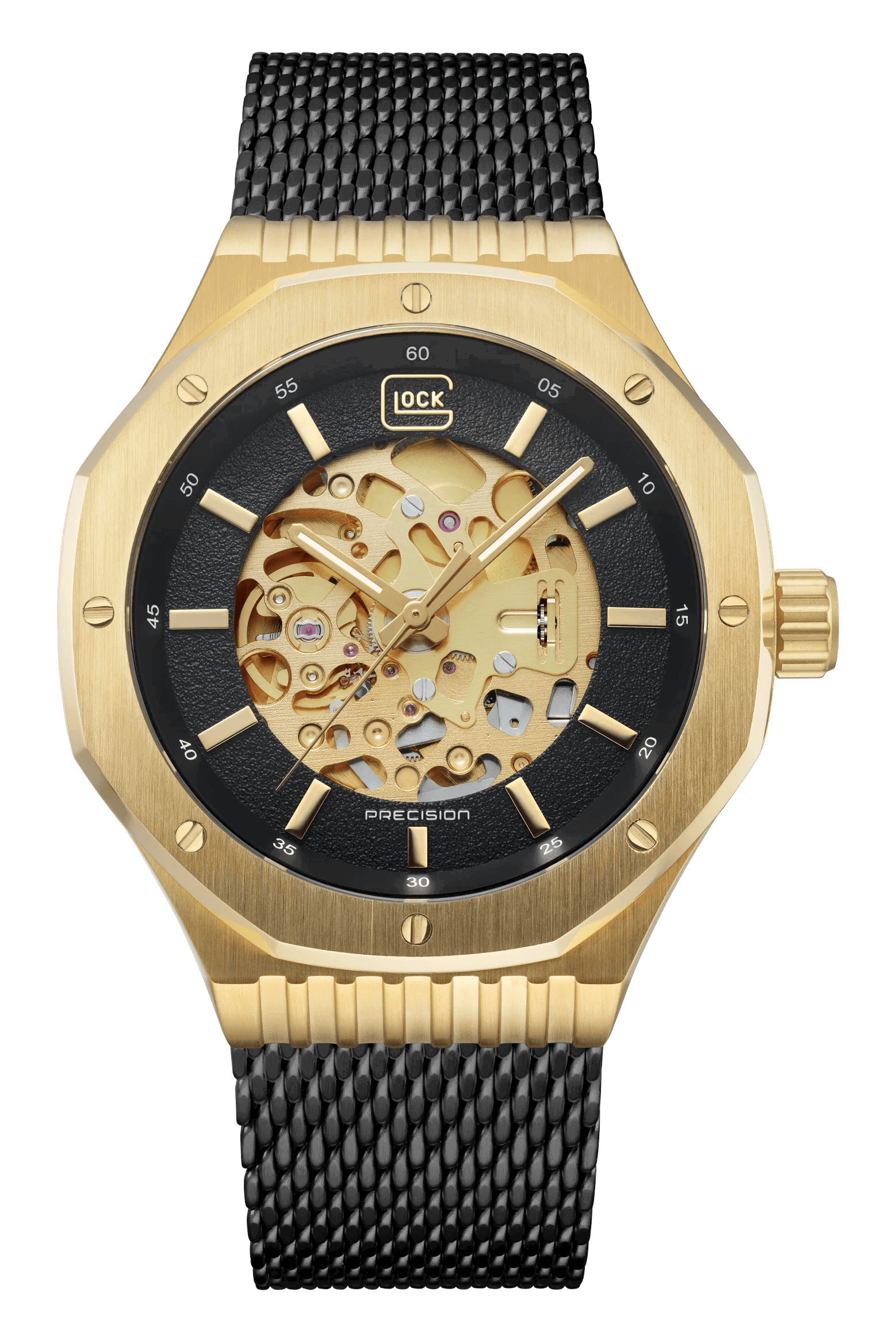 - GW-21-1-24 Glock Automatic Skeleton Dial Gold Case Black Strap Watch
