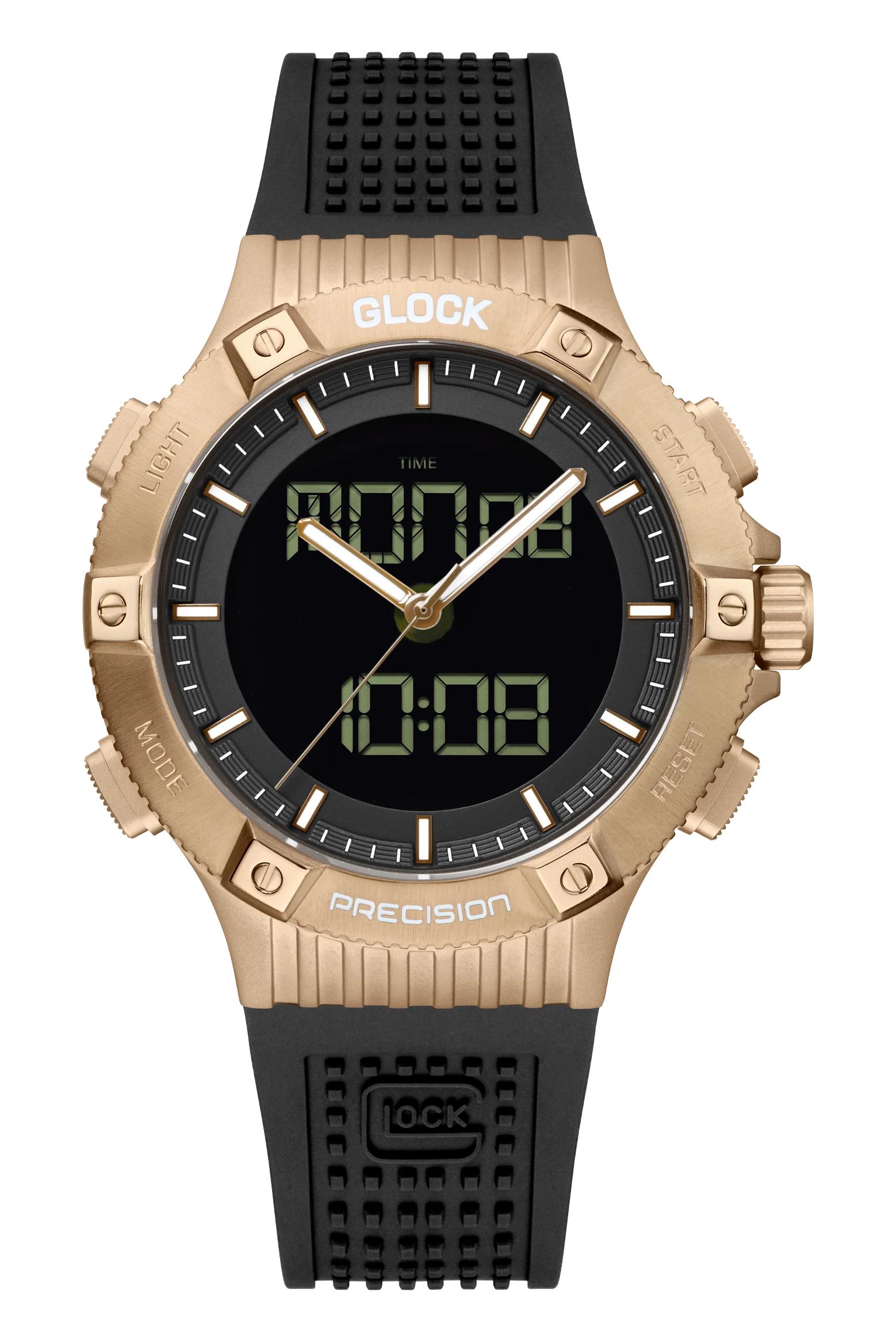 10 ATM WATER RESISTANCE, DIGITAL & ANALOG, CHRONOGRAPH, SAPPHIRE CRYSTALThis timepiece represents modern elegance. Its sandblasted stainless steel case in coyote is paired with a black silicone strap featuring GLOCK's RTF structure. The combination of an analog and digital time display, complemented by Swiss Super-LumiNova® hands and indices, ensures a precise and quick check of the time. With a chronograph function and a 10 ATM water-resistance rating, it merges reliability with style.