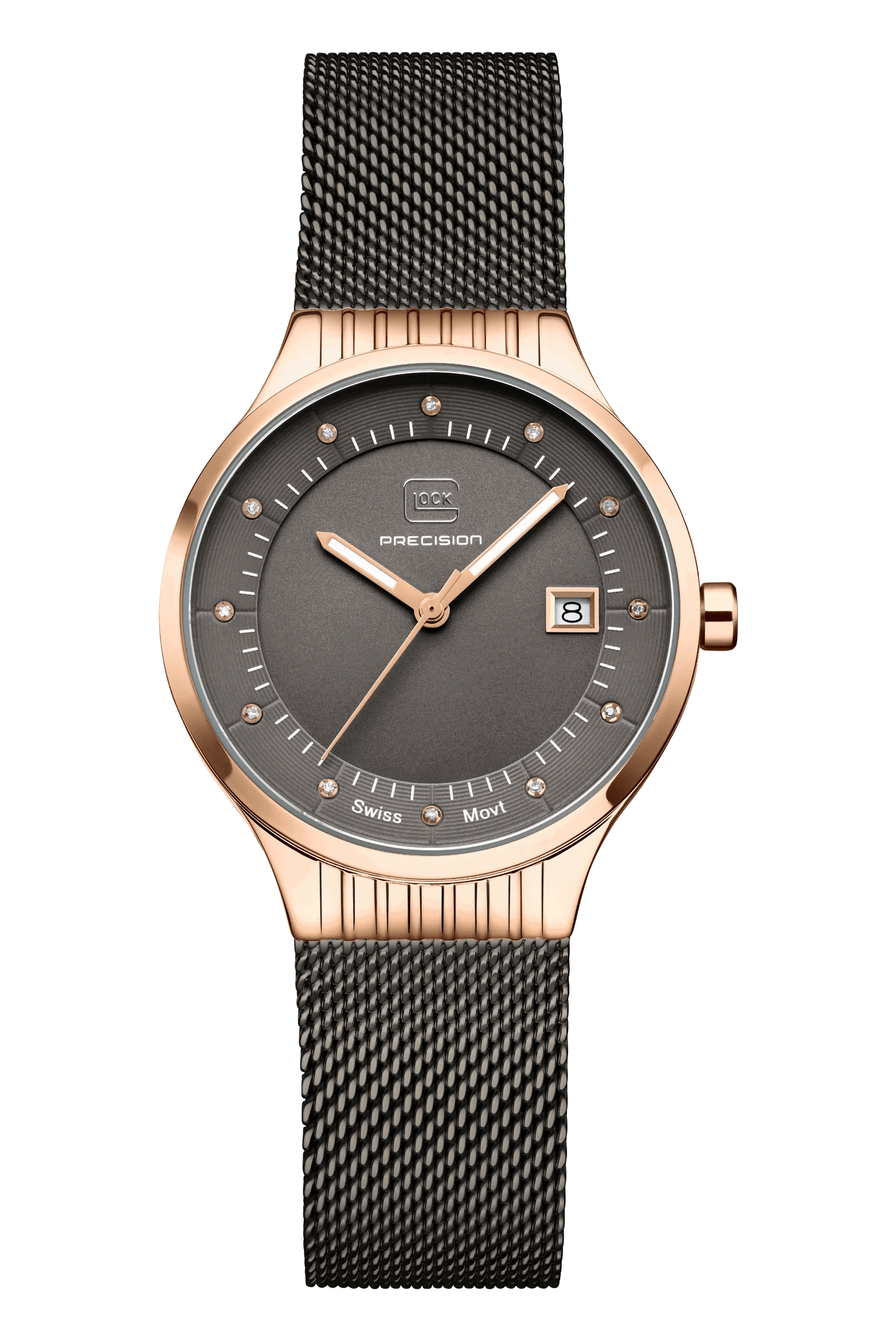 10 ATM WATER RESISTANCE, SWISS MOVEMENT, 12 REAL DIAMONDS, SAPPHIRE CRYSTALThis watch radiates classic elegance. Its shiny, rose gold-tone stainless steel case and gunmetal mesh band surround a reliable Swiss movement. The color-coordinated dial, accented by twelve genuine diamonds as well as hands featuring Swiss Super-LumiNova®, introduces an additional level of luxury. With 10 ATM water resistance, it unites premium functionality with timeless design.