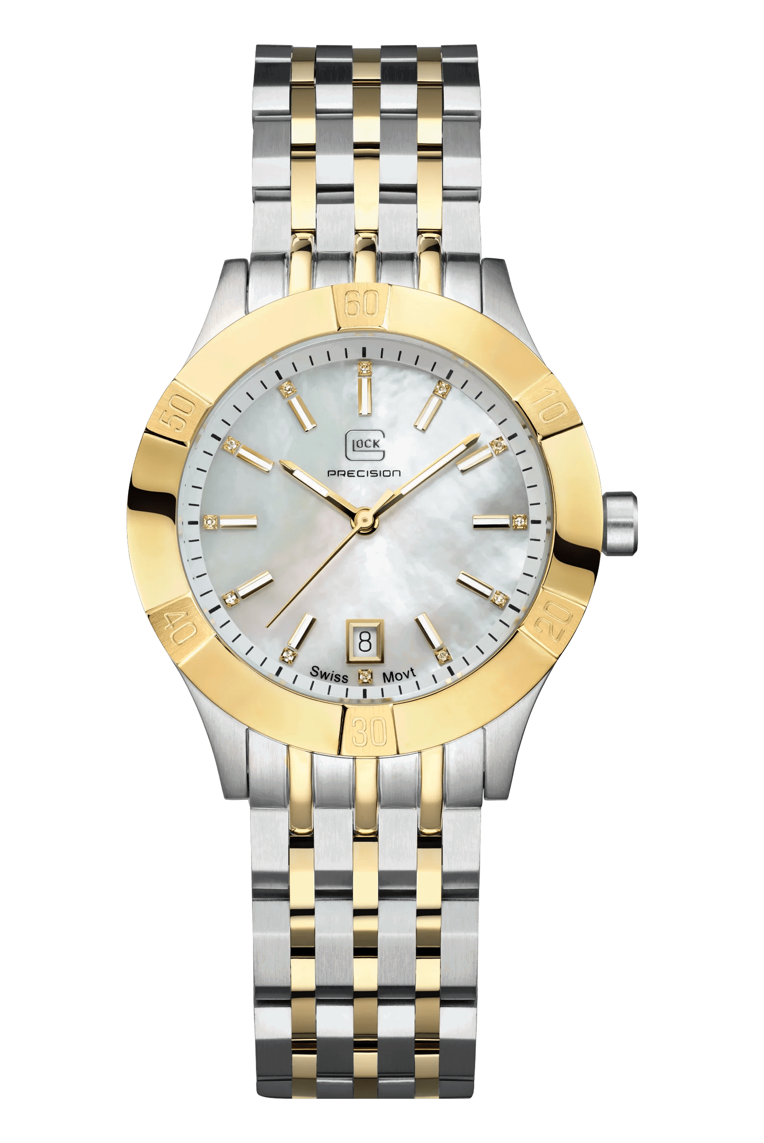 10 ATM WATER RESISTANCE, SWISS MOVEMENT, 12 REAL DIAMONDS, SAPPHIRE CRYSTALThe brushed stainless steel case is highlighted by a polished gold-tone bezel. The two-tone link strap elegantly complements a white mother-of-pearl dial, illuminated by hands and indices with Swiss Super-LumiNova®. With a precise Swiss movement and a reliable 10 ATM water-resistance rating, this watch fuses functionality with style.