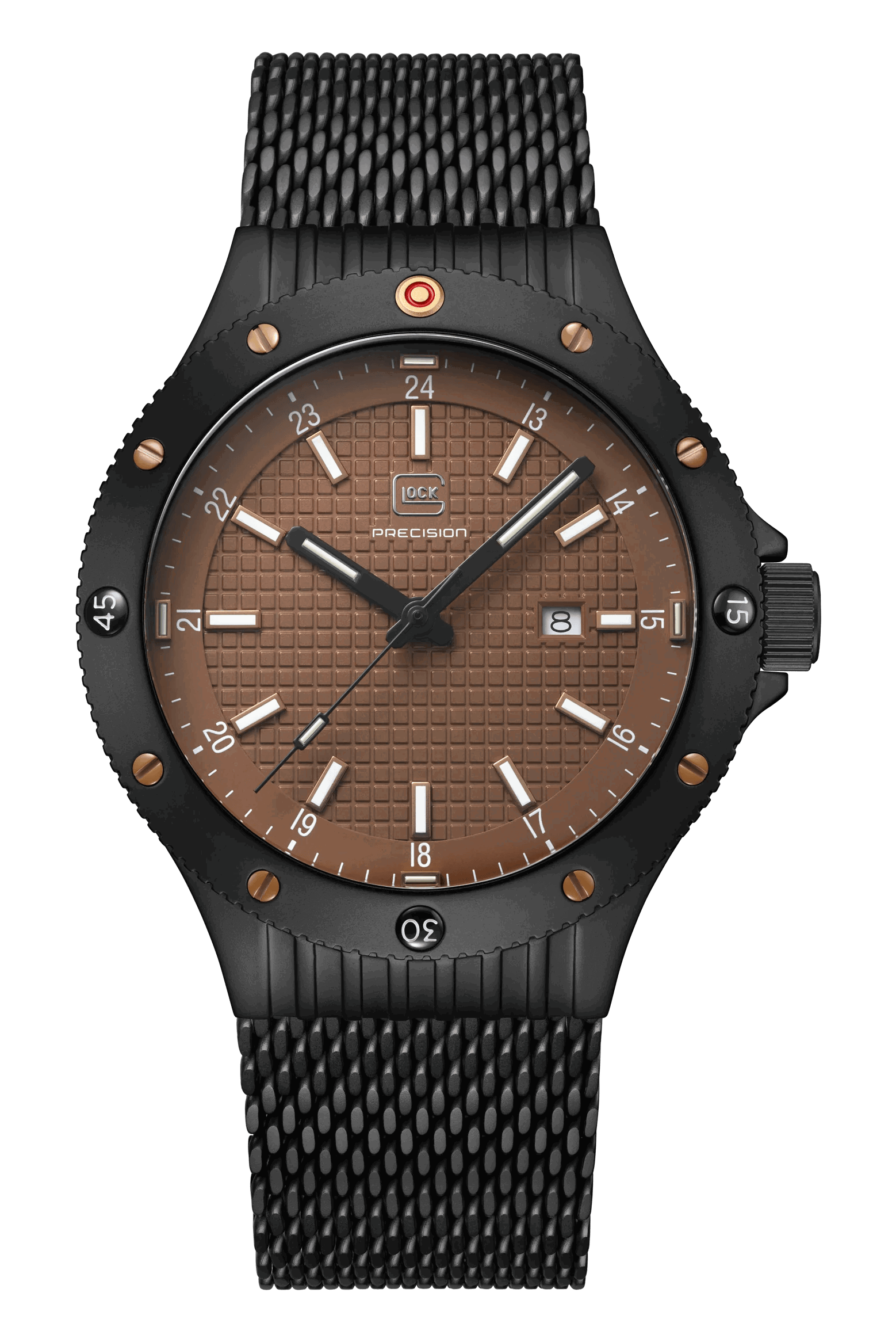10 ATM WATER RESISTANCE, SWISS MOVEMENT, ROTATING BEZEL, TRIGALIGHT®Bold character meets refined engineering in this exceptional timepiece. Encased in black stainless steel, the full coyote-tone dial with GLOCK’s signature RTF structure radiates tactical sophistication. Trigalights® integrated into the hands and at the 12, 3, 6, and 9-hour markers ensure constant readability, complemented by Swiss Super-LumiNova® for enhanced visibility in low light. A distinctive bullet detail on the bezel underscores the watch’s strong ballistic identity, while the black mesh strap provides a sleek, comfortable fit. Powered by a precise Swiss movement and water-resistant to 10 ATM, this watch embodies resilience, precision, and unmistakable GLOCK DNA.