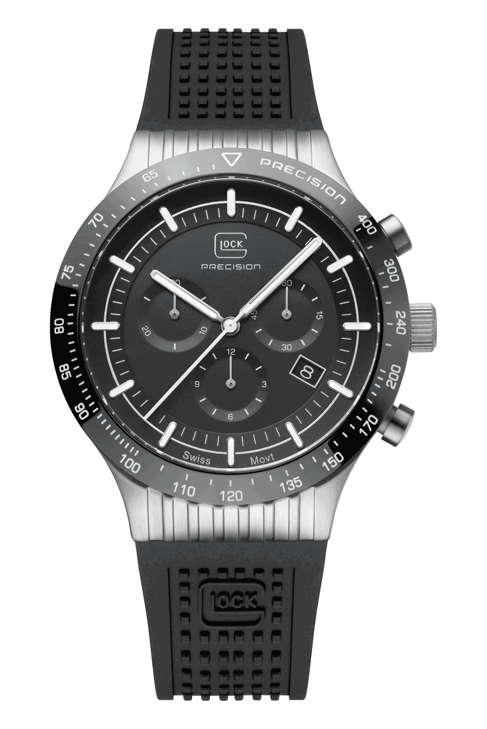 20 ATM WATER RESISTANCE, SWISS MOVEMENT, CHRONOGRAPH, LIMITED EDITIONCombining durability with elegance, this 7500-piece limited-edition watch showcases a brushed silver-tone stainless steel case with a polished black bezel. Hands and indices with Swiss Super-LumiNova® ensure clear readability, while the Swiss movement and a 20 ATM water-resistance rating ensure precision and reliability. To offer versatility of style, each order includes two interchangeable straps: a black silicone strap with GLOCK's RTF texture and a silver-tone stainless steel mesh strap