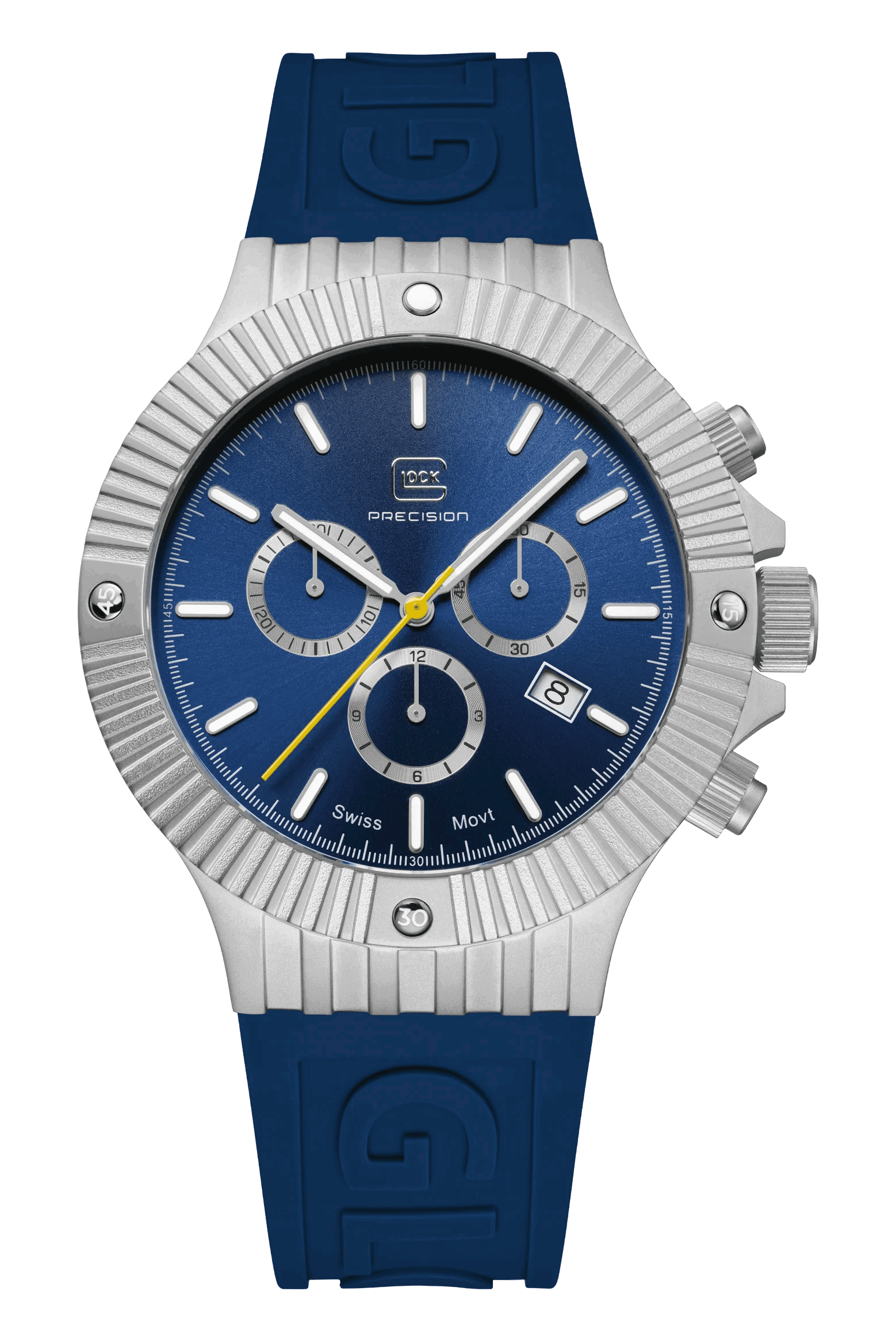 20 ATM WATER RESISTANCE, SWISS MOVEMENT, CHRONOGRAPH, SAPPHIRE CRYSTALThe sandblasted stainless steel case pairs with the blue silicone strap featuring GLOCK lettering. The blue dial is protected by scratch-resistant sapphire crystal. Hands and indices featuring Swiss Super-LumiNova® enhance clarity, while the yellow second hand adds a distinctive touch to the dial. With a Swiss movement, a chronograph function, and a 20 ATM water-resistance rating, this watch exemplifies precision and reliability.
