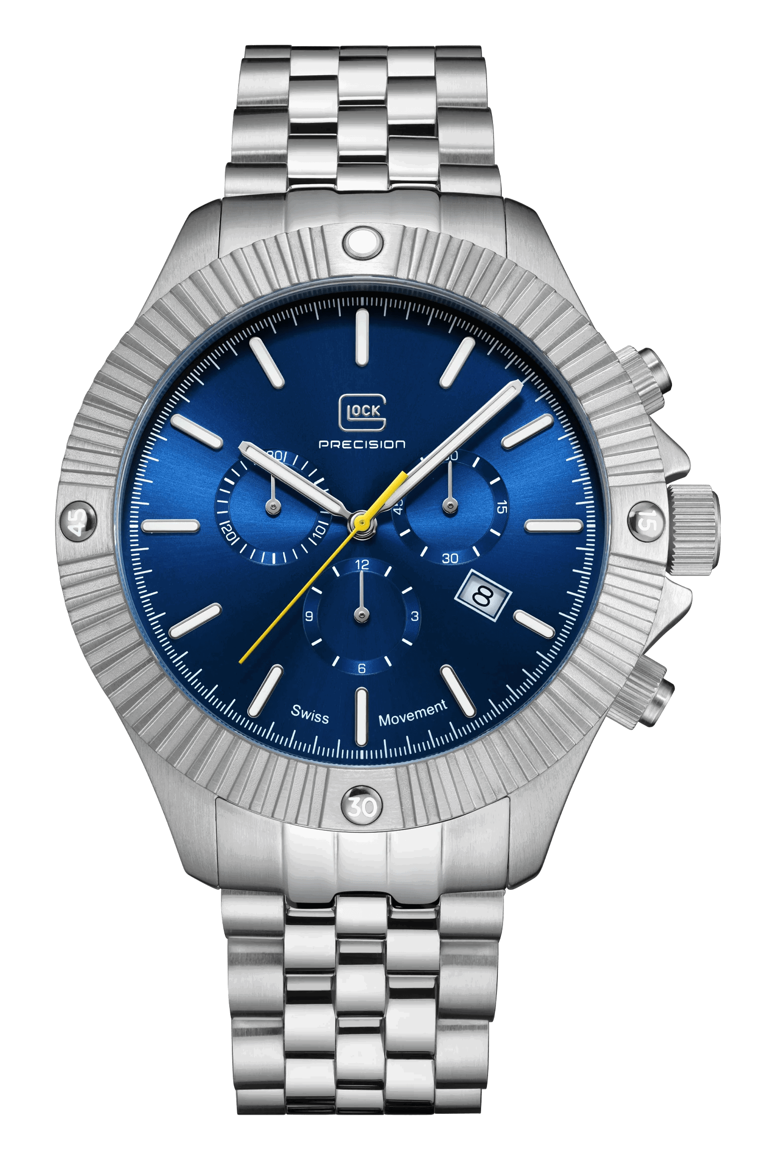 20 ATM WATER RESISTANCE, SWISS MOVEMENT, CHRONOGRAPH, SAPPHIRE CRYSTALModern aesthetics meet precision and accuracy. The elegant stainless steel case surrounds the blue dial with a yellow second hand, protected by scratch-resistant sapphire crystal. The stainless steel link strap fits seamlessly into this color scheme. Inside, a Swiss movement ensures lasting precision. Equipped with hands and indices featuring Swiss Super-LumiNova®, a 20 ATM water-resistance rating, and a practical chronograph function, this watch combines functionality and style.