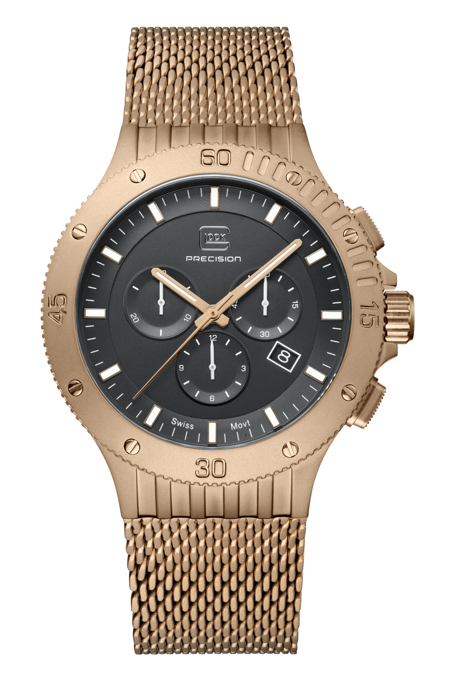 20 ATM WATER RESISTANCE, SWISS MOVEMENT, CHRONOGRAPH, SAPPHIRE CRYSTALThis watch unites craftsmanship and timeless elegance. The coyote-tone stainless steel case matches the color-coordinated mesh strap. The black dial, illuminated by hands and indices with Swiss Super-LumiNova® and protected by sapphire crystal, operates with the precision of a reliable Swiss movement. With a 20 ATM water-resistance rating and a chronograph, it combines functionality and style.
