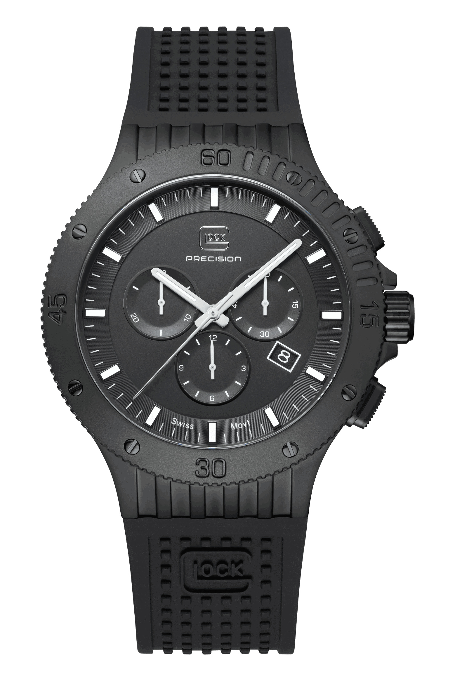 20 ATM WATER RESISTANCE, SWISS MOVEMENT, CHRONOGRAPH, SAPPHIRE CRYSTALThis watch combines precision and style. Its elegant black stainless steel case complements the matching silicone strap with GLOCK's RTF texture. The black dial, accentuated by silver-tone hands and indices with Swiss Super-LumiNova®, is protected by resilient sapphire crystal. Powered by a Swiss movement, it guarantees reliability and accuracy. Accompanied by a chronograph and a 20 ATM water-resistance rating, this timepiece is certain to be a versatile companion for adventures.