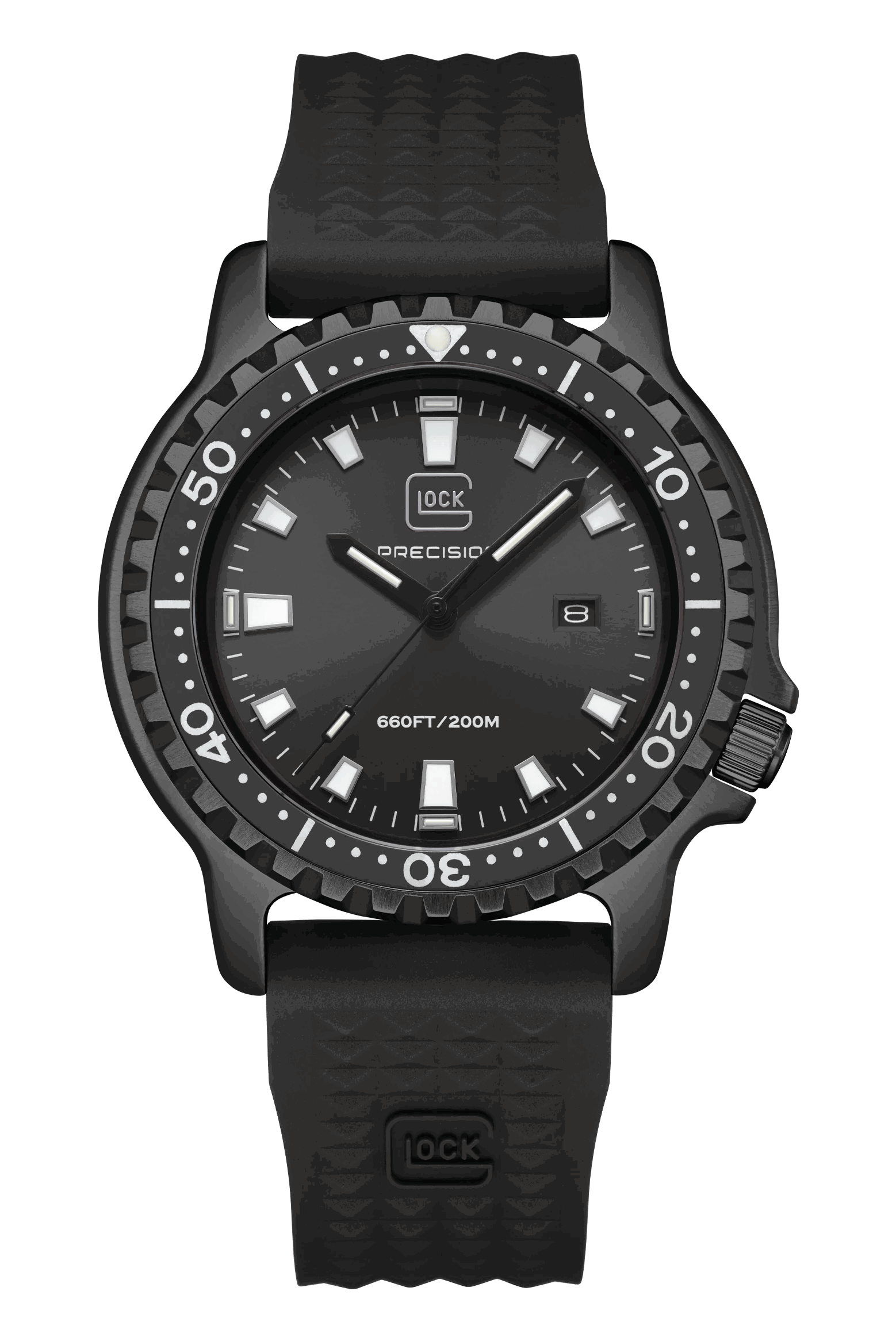 20 ATM WATER RESISTANCE, ROTATING BEZEL, Swiss Super-LumiNova®, TRIGALIGHT®Tactical precision meets enduring performance in this diver-style timepiece. The matte black stainless steel case frames a black dial accented by white details on the hands and indices, creating a clean, high-contrast look. Trigalights® at the 12, 3, 6, and 9-hour positions ensure constant illumination, while Swiss Super-LumiNova® on the remaining markers provides exceptional visibility in low-light environments. The black silicone strap offers durability and comfort, complementing the watch’s bold, utilitarian aesthetic. Powered by a reliable Swiss movement and water-resistant to 20 ATM, this watch embodies the essence of precision engineering and resilient GLOCK design. (Please note that this watch is not compatible with the straps available on our website.)