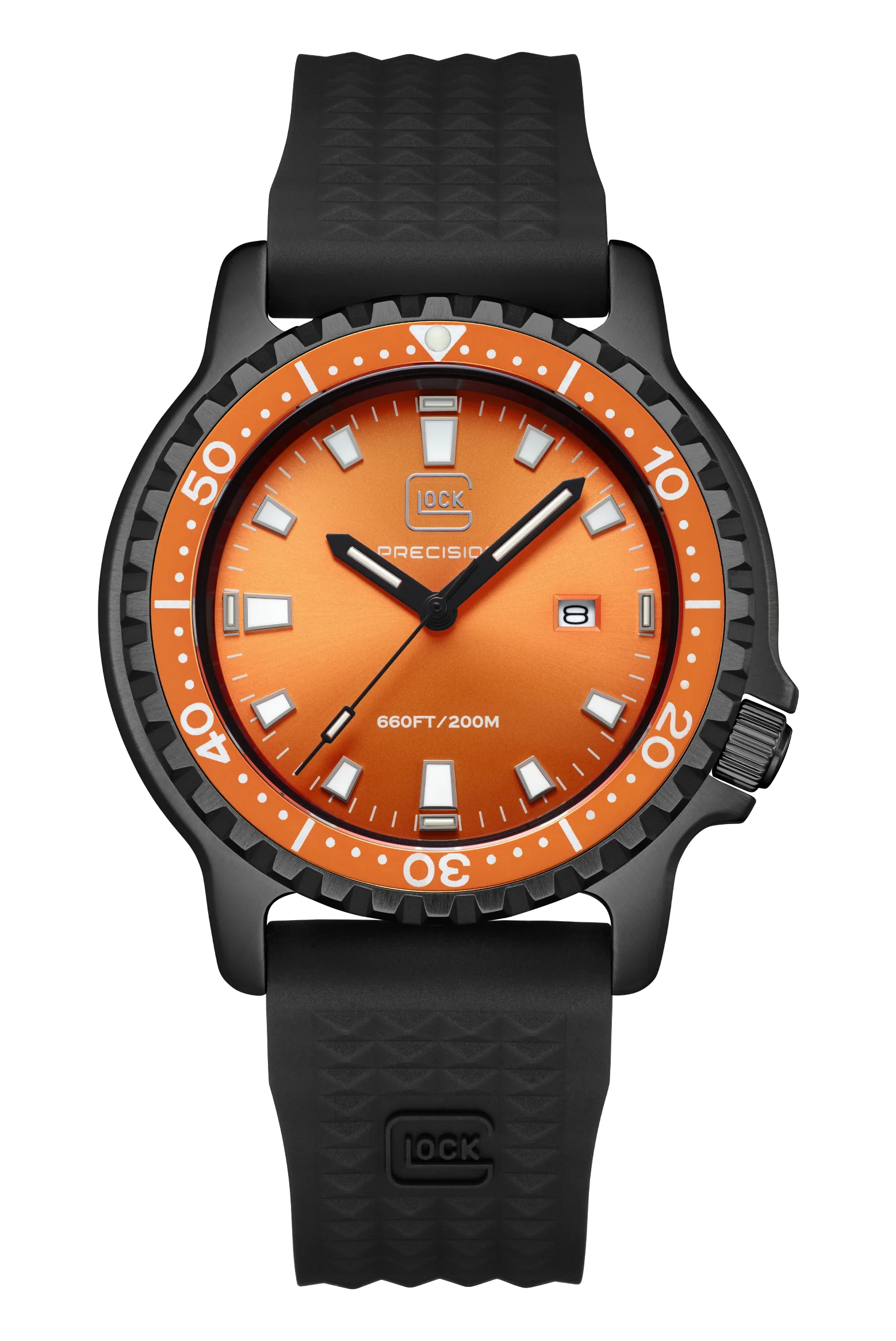 20 ATM WATER RESISTANCE, ROTATING BEZEL, Swiss Super-LumiNova®, TRIGALIGHT®Bold aesthetics meet uncompromising performance in this diver-style timepiece. The matte black stainless steel case surrounds a vivid orange dial that commands attention while ensuring optimal readability beneath any light condition. White-accented hands and indices stand out sharply against the dial, enhanced by Trigalights® at the 12, 3, 6, and 9-hour positions and Swiss Super-LumiNova® on the remaining markers. The black silicone strap offers lasting comfort and durability, perfectly complementing the watch’s dynamic character. Driven by a precise Swiss movement and water-resistant to 20 ATM, this watch unites functionality, resilience, and the unmistakable confidence of GLOCK design. (Please note that this watch is not compatible with the straps available on our website.)