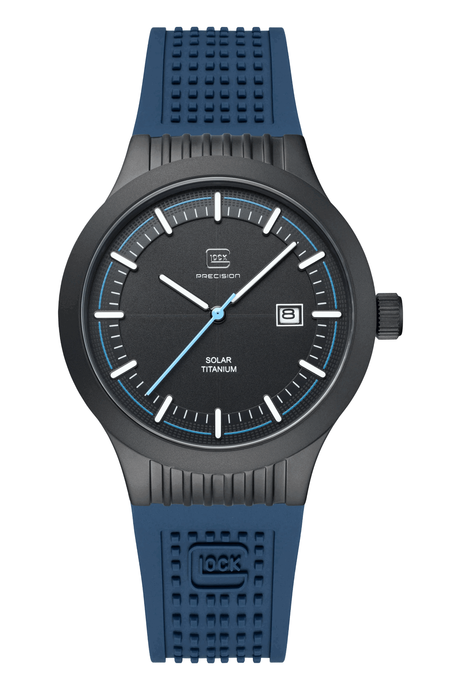 20 ATM WATER RESISTANCE, TITANIUM, SOLAR WATCH, SAPPHIRE CRYSTALThe black titanium case unites comfort and strength. The blue second hand stands out prominently against the black dial, which also serves as the perfect backdrop for the hands and indices to glow brilliantly thanks to Swiss Super-LumiNova®. The color-coordinated, blue silicone strap with GLOCK lettering ensures a secure and comfortable fit. Powered by a solar movement and with water resistance to 20 ATM, this watch offers a blend of functionality and style that meets GLOCK Watches' discerning standards.