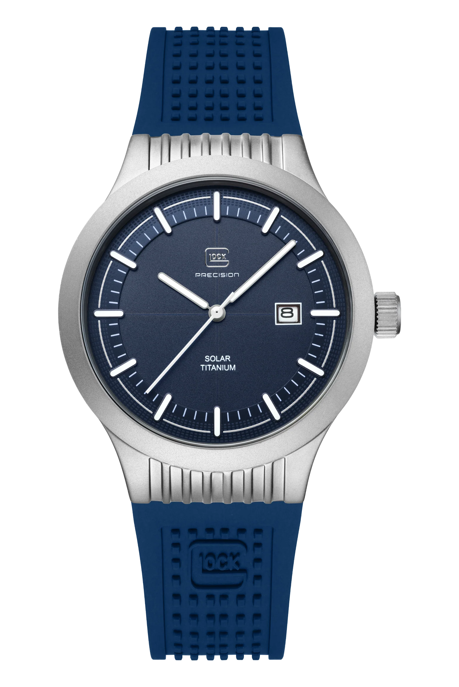 20 ATM WATER RESISTANCE, TITANIUM, SOLAR WATCH, SAPPHIRE CRYSTALA combination of precision and modern flair. The sandblasted titanium case encloses a deep blue dial illuminated by indices and hands with Swiss Super-LumiNova®. A white accent ring discreetly highlights the graphic elements on the outer edge of the dial, reminiscent of GLOCK's RTF texture. Complemented by a matching silicone strap, powered by a reliable solar movement, and rated to 20 ATM water resistance, this watch represents sophisticated design and technical precision.