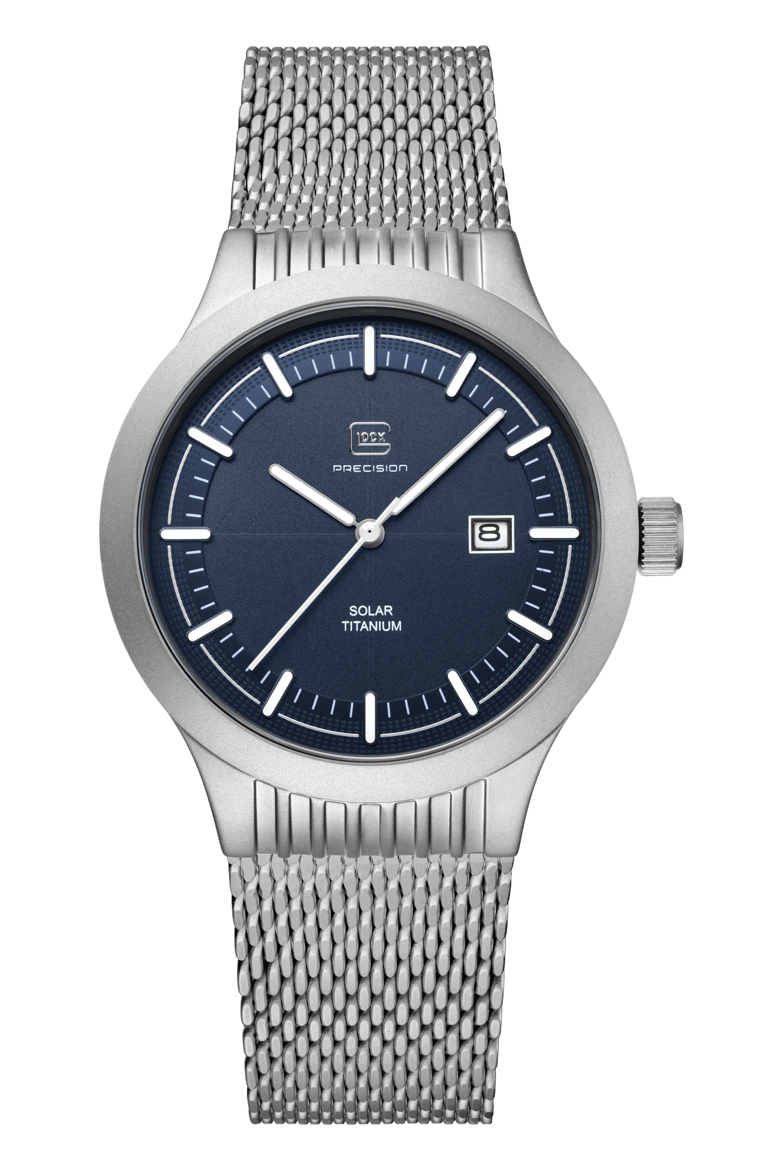 20 ATM WATER RESISTANCE, TITANIUM, SOLAR WATCH, SAPPHIRE CRYSTALA combination of precision and modern flair. The sandblasted titanium case encloses a deep blue dial illuminated by indices and hands with Swiss Super-LumiNova®. A white accent ring discreetly highlights the graphic elements on the outer edge of the dial, reminiscent of GLOCK's RTF texture. Complemented by a sturdy stainless steel mesh strap, powered by a reliable solar movement, and rated to 20 ATM water resistance, this watch represents sophisticated design and technical precision.